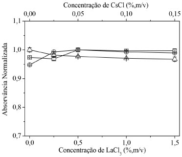 ![]() Figura 3. Absorvância de Mg em funçao da concentraçao de CsCl e LaCl3 em soluçoes de amostras de cerâmica em meio de ácido. Concentraçao de HNO3: 1,6 % m/v. Concentraçao de HF: (□) 1,0; (○) 2,0 e (△) 4,0 % m/v