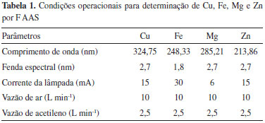 PARTE EXPERIMENTAL Instrumentaçao Para a determinaçao dos elementos Cu, Fe, Mg e Zn, foi utilizado um espectrômetro de absorçao atômica com chama da Perkin Elmer, modelo AAnalyst 200 (Shelton, CT, EUA), equipado com lâmpadas de cátodo oco para cada analito (Perkin Elmer, Shelton, CT, EUA) e uma lâmpada de arco de deutério para correçao do sinal de fundo. A chama foi composta por uma mistura de ar (gás oxidante) e acetileno (gás combustível) (Linde, Barueri, SP, Brasil). As condiçoes operacionais estao apresentadas na Tabela 1.