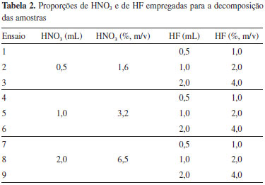 A condiçao que apresentou uma melhor sensibilidade, dada pelos maiores valores de absorvância obtidos, foi aquela em que se empregou a menor massa de amostra (25 mg) e granulometrias menores que 53 µm. Já para as soluçoes com maiores massas (100 e 250 mg), foi obtida uma menor relaçao do sinal de absorvância por grama de amostra, principalmente para os analitos Cu, Mg e Zn. Esse fato pode ser explicado pelo aumento da presença da matriz da amostra, que pode causar um efeito no transporte da soluçao da amostra e, também, pode causar interferência de atomizaçao devido ao aumento da quantidade de matriz no atomizador. De acordo com os resultados obtidos, as soluçoes foram preparadas com amostras cujas partículas eram inferiores a 25 µm, uma vez que, assim, é possível aumentar a sensibilidade, além de facilitar o processo de decomposiçao das amostras, melhorando a atomizaçao dos analitos. Avaliaçao da concentraçao de ácido para o preparo das amostras Para o método de decomposiçao ácida assistida por ultrassom, fez-se a variaçao do volume de ácido para 25 mg e, desse modo, da concentraçao de cada ácido empregado nas soluçoes finais, de acordo com as proporçoes apresentadas pela Tabela 2.