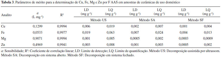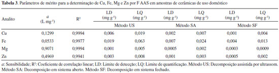 É possível perceber uma concordância entre as intensidades dos sinais para as diferentes soluçoes ácidas a partir da concentraçao de 0,05% m/v de CsCl e 0,5% m/v de LaCl3, mesmo variando a concentraçao de HF. Sendo assim, essa concentraçao foi escolhida para as posteriores determinaçoes desse analito por F AAS. Concentraçao de Cu, Fe, Mg, e Zn em cerâmicas de uso doméstico Após estabelecer as melhores condiçoes para o preparo de decomposiçao ácida assistida por ultrassom (US), o método foi aplicado em oito diferentes amostras de louças cerâmicas para a determinaçao de Cu, Fe, Mg e Zn por F AAS. As amostras também foram preparadas usando os procedimentos 2 e 3, envolvendo a decomposiçao em sistema aberto (SA) e a decomposiçao em sistema fechado (SF), respectivamente. Os parâmetros de mérito obtidos para essas determinaçoes estao dispostos na Tabela 3. A faixa linear de trabalho para os analitos foram: 1,0 a 4,0 mg L-1 para Cu; 1,0 a 6,0 mg L-1 para Fe; 0,1 a 0,4 mg L-1 para Mg e 0,5 a 2,0 mg L-1 pra Zn. Os valores de coeficiente de correlaçao linear foram todos maiores que 0,99.