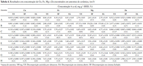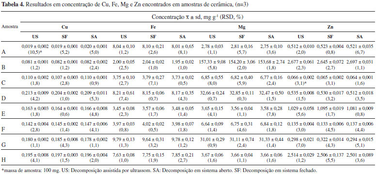 Verificou-se um menor limite de detecçao (LD) e limite de quantificaçao (LQ) para a decomposiçao em sistema fechado, uma vez que, nesse procedimento, utiliza-se uma massa de amostra maior para a etapa de decomposiçao. Já para o método de decomposiçao ácida assistida por ultrassom, é requerida uma pequena quantidade de massa de amostra, o que reflete em limites de detecçao e quantificaçao maiores, mas, ainda assim, extremamente adequados para as determinaçoes dos analitos Cu, Fe, Mg e Zn nessas amostras. Os resultados encontrados, em relaçao à concentraçao dos analitos nas amostras que foram preparadas pelos três métodos, estao apresentados na Tabela 4.