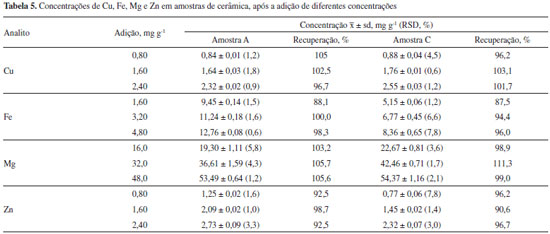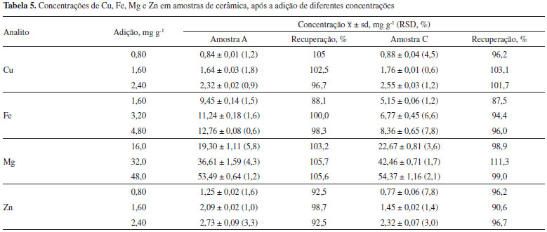 Para a determinaçao de Cu na amostra A e de Zn na amostra C, ambas preparadas pelo método US, os valores obtidos ficaram abaixo do limite de detecçao do analito quando se utilizou uma massa de 25 mg. Essas amostras foram preparadas novamente pelo mesmo método e foi possível quantificar esse analito, uma vez que foi utilizada uma maior massa (aproximadamente 100 mg). Os resultados obtidos, portanto, foram concordantes com aqueles dos demais métodos utilizados, que utilizam maior massa de amostra. Dessa forma, é possível mostrar que o método proposto envolvendo a decomposiçao assistida por ultrassom é robusto, ou seja, é susceptível a variaçoes experimentais, como no caso da variaçao de massa, propiciando uma melhora de 4 vezes nos valores de LD e LQ. Para a comparaçao de métodos, foi aplicado o teste estatístico t, pareado para um limite de confiança de 95%, pelo qual foi possível verificar que nao há diferenças significativas entre os resultados encontrados com o método proposto envolvendo o uso do ultrassom em relaçao aos métodos comparativos (sistema aberto e sistema fechado). Com relaçao à precisao, todos os métodos apresentaram resultados próximos e com baixos valores de desvio padrao relativo (RSD, %), uma vez que as médias desses desvios foram de 3,0; 2,7 e 3,0 para os métodos de US, SF e SA, respectivamente, confirmando que todos os procedimentos fornecem uma completa decomposiçao da matriz das amostras de cerâmica de uso doméstico. Conforme os resultados apresentados na Tabela 4, de um modo geral, o Cu foi o elemento que apresentou as menores concentraçoes nas amostras de cerâmica de uso doméstico analisadas. Essa baixa concentraçao pode ser oriunda de algum pigmento utilizado para a decoraçao das louças. Já o Mg foi obtido em uma concentraçao elevada em todas as amostras, quando comparado com os demais analitos determinados, mas com destaque para a amostra B, que apresentou uma concentraçao de aproximadamente 150 mg g-1 para esse analito. Essa concentraçao é de origem, possivelmente, da massa cerâmica industrial, que pode conter Mg em sua composiçao devido aos ingredientes que sao adicionados durante o processo de produçao (sais e óxidos) ou diretamente da matéria-prima (como, por exemplo, a magnesita).28-30 Além disso, a presença desse analito pode ser devido à adiçao de óxido de magnésio, que é vantajoso devido ao aumento da propriedade de refratariedade das peças.28-31 Para o Fe, as concentraçoes encontradas mostraram-se próximas para todas as amostras, variando de 2,0 a 9,8 mg g-1. Uma concentraçao baixa é esperada para esse analito, uma vez que o óxido de ferro pode influenciar na brancura do produto cerâmico queimado, afetando, assim, a eficácia dos pigmentos que sao adicionados para dar coloraçao aos utensílios cerâmicos.32 Para Zn, duas amostras, B e H, apresentaram concentraçoes semelhantes e superiores às demais. Essa concentraçao pode estar associada ao esmalte cerâmico, que pode conter óxido de zinco como um de seus componentes.33 Todas as amostras avaliadas sao fabricadas em indústrias distintas, o que explica a grande discrepância na concentraçao dos analitos quantificados. Isso se deve, ainda, a diferentes processos industriais utilizados por cada fabricante, incluindo desde a matéria prima, fundentes, ingredientes refratários, até as tintas utilizadas, o que acaba deixando os utensílios cerâmicos aparentemente iguais, contudo com composiçoes químicas diferentes. Para avaliar a exatidao do método proposto de decomposiçao ácida assistida por ultrassom, testes de adiçao e recuperaçao dos analitos foram realizados em três níveis de concentraçao. Ressaltamos que esse teste pode ser utilizado com segurança pelo método proposto, uma vez que foi assegurada a completa decomposiçao das amostras. Os resultados obtidos para a concentraçao total (amostra + adiçao) estao apresentados na Tabela 5.