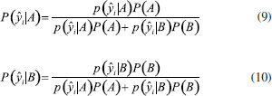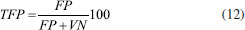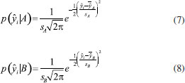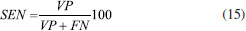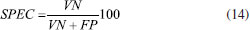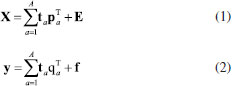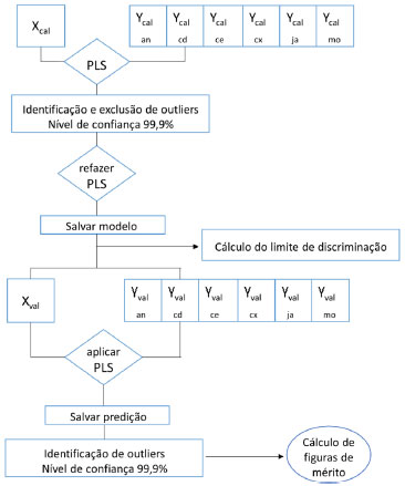 Os parâmetros T2 de Hotelling e resíduos Q foram aplicados da mesma maneira para as amostras do conjunto de validaçao. Por outro lado, o teste t para resíduos de Student foi adaptado para estabelecer apenas o limite superior para as estimativas da classe 1 e o limite inferior para as estimativas da classe 0 de acordo com as equaçoes 3 e 4: ![]() em que Levando em conta esses critérios, a identificaçao e a exclusao de amostras anômalas foram realizadas em apenas uma etapa. Inicialmente, um primeiro modelo PLS1-DA foi construído para a discriminaçao de cada classe em relaçao às demais e os valores extremos foram excluídos do conjunto de treinamento. Em seguida, o modelo foi calculado com as amostras restantes e considerado otimizado. Após otimizaçao do modelo, um limite de discriminaçao foi calculado com base na dispersao dos valores estimados de y para as amostras de treinamento de forma a minimizar a ocorrência de erros positivos falsos e negativos de acordo com o teorema de Bayes.16,18,23 Conforme definido anteriormente, é considerada a discriminaçao das amostras em duas classes, uma delas contendo as amostras da espécie que será discriminada, a qual será atribuído o valor de classe y=1 (classe A), e a outra contendo todas as amostras das demais espécies, as quais terao valor de classe y=0 (classe B). A partir dos valores estimados para o conjunto de treinamento sao estimadas as probabilidades a priori (P(A) e P(B)) e as funçoes de densidade de probabilidade (p(ŷi|A) e p(ŷi|B)) de cada classe. Considerando que as distribuiçoes dos valores de classe estimados para as classes A e B se aproximam de uma distribuiçao normal, esses parâmetros podem ser definidos como:23 ![]() ![]() A partir desses parâmetros, a probabilidade de uma amostra i pertencer às classes A ou B podem ser determinadas, respectivamente, por:18,23 ![]() De acordo com a regra de Bayes uma amostra é atribuída à classe A se P(ŷi|A) > P(ŷi|B), caso contrário a amostra é atribuída à classe B. Outra maneira de tomar essa decisao é através da determinaçao do limite de discriminaçao, o qual é obtido através do valor de y no qual P(ŷi|A) = P(ŷi|B). Considerando que o denominador das equaçoes 9 e 10 sao iguais, a determinaçao do limite se simplifica a:23 ![]() O limite de discriminaçao é entao obtido pela substituiçao das equaçoes 5 a 8 na equaçao 11, substituiçao dos valores experimentais e determinaçao do valor de y. Detalhes dessas operaçoes sao apresentados no material suplementar. É importante destacar que se as probabilidades de ocorrência das classes A ou B forem iguais (P(A)=P(B)), as equaçoes 9 e 10 passarao a depender apenas das funçoes de densidade de probabilidade de A e B. Na prática, em muitas situaçoes o conjunto de treinamento nao permite a obtençao de amostras que sejam boas aproximaçoes das probabilidades de ocorrência das classes estudadas em amostras futuras. Nesses casos, é aconselhável a consideraçao de que P(A)=P(B). Portanto, uma amostra genérica i é identificada como pertencente à classe 1 caso seu valor de classe estimado (yi) for maior que o valor do limite de discriminaçao do modelo PLS1-DA correspondente. Caso contrário, essa amostra será identificada como pertencendo à classe 0, que contém as amostras de todas as demais classes modeladas. Determinaçao de figuras de mérito dos modelos PLS-DA A validaçao dos modelos de discriminaçao foi avaliada de acordo com o cálculo das figuras de mérito, conforme descrito por Botelho et al. e definidas a seguir.18 A taxa de falsos positivos (TFP) representa o percentual de amostras que apresentaram erros falso positivos e é calculada como a relaçao entre o número absoluto de falsos positivos (FP) e a soma do número absoluto de erros falso positivos (FP) e verdadeiros negativos (VN) multiplicada por 100, representada pela equaçao: ![]() Por outro lado, a taxa de falsos negativos (TFN) representa o percentual de amostras que apresentou erros falso negativos, sendo calculada como a relaçao entre o número absoluto de falsos negativos (FN) e a soma do número absoluto de erros falso negativos (FN) e verdadeiros positivos (VP) multiplicada por 100, representada pela equaçao: ![]() A especificidade (SPEC) representa o percentual de amostras pertencentes às outras classes (y=0) que foram identificadas como pertencentes a essas classes. Essa figura de mérito é calculada pela razao entre o número absoluto de verdadeiros negativos (VN) e a soma do número absoluto de verdadeiros negativos (VN) e dos erros falso positivos (FP) multiplicado por 100, representada pela equaçao: ![]() De forma complementar, a sensibilidade (SEN) representa o percentual de amostras pertencentes à classe discriminada que foram identificados como sendo dessa classe. Portanto, sendo calculada como a razao entre o número absoluto de verdadeiros positivos (VP) e a soma do número absoluto de verdadeiros positivos (VP) e dos erros falso negativos (FN) multiplicada por 100, representada pela equaçao: ![]() Por fim, a taxa de eficiência (TEF) dos modelos de discriminaçao pode ser obtida pela diferença entre o valor de 100% e a soma das taxas de erros falso negativos (TFN) e falso positivos (TFP), representada pela equaçao: ![]() O desenvolvimento dos modelos e posterior validaçao seguiram o procedimento descrito na Figura 1.