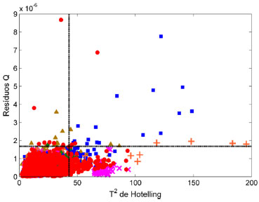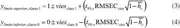 A Figura 4 apresenta a distribuiçao dos valores estimados obtidos tanto para o conjunto de treinamento quanto de validaçao. As amostras anômalas detectadas na etapa de validaçao sao destacadas nessa figura como cor preta, na qual se observa a presença de amostras fora dos limites estabelecidos para as estimativas dos valores de classe e amostras dentro dos limites, que foram caracterizadas como anômalas pelos elevados valores de T2 de Hotelling e resíduos Q. É interessante observar que nesse estudo muitas das amostras identificadas como anômalas por estarem fora dos limites definidos equaçoes 3 e 4 nao acarretariam em erros de discriminaçao. Contudo, como o PLS-DA, em sua essência, é um modelo de regressao, e em aplicaçoes quantitativas elevados erros na estimativa da propriedade de interesse caracterizam amostras anômalas, o uso dos limites para os valores estimados de classe representa um parâmetro a mais de segurança que pode ajudar na prevençao de erros de classificaçao quando forem analisadas amostras em condiçoes distintas das empregadas na fase de treinamento ou análise de amostras de classes/espécies nao modeladas. As amostras identificadas como anômalas nao foram consideradas para o cálculo dos valores de TFN, TFP e TEF.