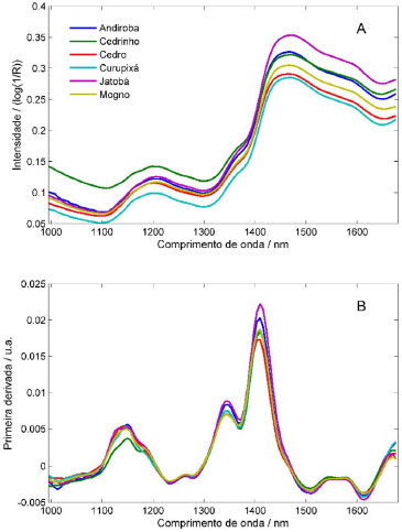 ![]() Figura 2. Espectros médios do conjunto de treinamento sem pré-processamento (A) e pré-processados com primeira derivada (B) de cada uma das 6 espécies florestais