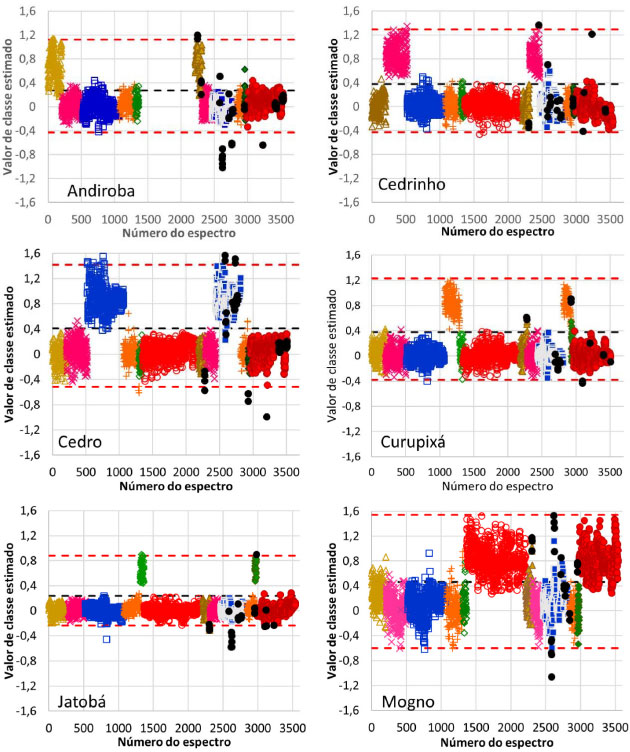 Figura 4. Distribuiçao dos valores estimados do conjunto de treinamento e validaçao para os modelos PLS-DA para as seis espécies. ( ) andiroba, ( ) cedrinho, ( ) cedro, ( ) curipixá, ( ) jatobá, ( ) mogno, (símbolos vazios) calibraçao, (símbolos cheios) validaçao e (símbolos em preto) amostras anômalas do conjunto de validaçao