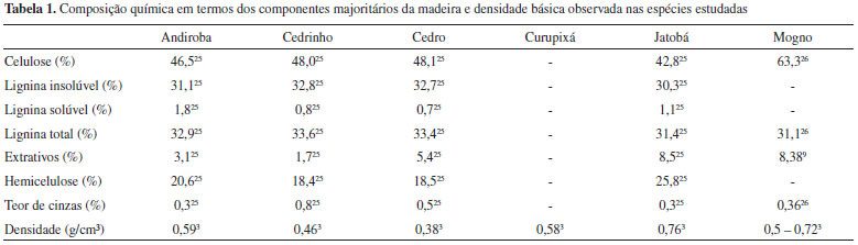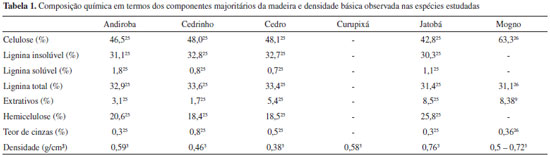 A Tabela 1 apresenta a composiçao química, em termos dos componentes majoritários da madeira (lignina, celulose, extrativos e teor de cinzas), e densidade básica das espécies estudadas. Esses dados permitem observar algumas das diferenças existentes entre as espécies e que justificam o sucesso da discriminaçao por NIR. Observa-se que a espécie mogno apresenta um teor de celulose maior que o observado nas outras espécies. Além disso, o teor de extrativos de mogno se diferencia das espécies andiroba, cedrinho e cedro, sendo semelhante com relaçao ao teor percentual ao jatobá. Contudo, deve-se destacar que apesar do teor percentual de extrativos das espécies mogno e jatobá ser semelhante, os compostos que formam os extrativos podem ser diferentes, de forma que, ao contrário dos componentes da Tabela 1, um teor próximo de extrativos nao implica necessariamente em uma similaridade entre espécies. Observa-se ainda que as espécies andiroba, cedrinho e cedro apresentam variaçoes significativas entre seus teores de extrativos. É importante ressaltar ainda que o espectro NIRS é uma resposta que varia nao somente em relaçao à quantidade de componentes químicos presentes na madeira. A maneira com que esses compostos estao distribuídos e organizados também é um fator significativo. Parte desses aspectos se reflete na densidade dessas madeiras, as quais também apresentam variaçoes significativas. Outro fato que chama a atençao na Tabela 1 é a ausência de dados para a espécie Micropholis melinoniana (curupixá). No melhor de nosso conhecimento, nao existem dados na literatura sobre os parâmetros incluídos na Tabela 1 para essa espécie, que é nativa do Brasil.