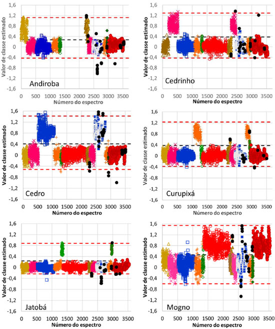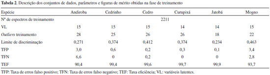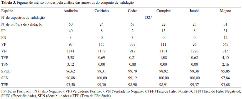 Observa-se, ainda na Tabela 2, que o número de amostras anômalas excluídas foi relativamente pequeno, sendo no máximo igual a 1,3% das amostras de calibraçao para a discriminaçao da espécie andiroba. Além disso, pode-se observar ainda que as taxas de eficiência foram sempre superiores a 90%, variando entre 90,4 a 99,7%, o que demonstra que os modelos apresentaram uma elevada taxa de acerto. De forma geral, os valores de TFN e TFP foram próximos para a maioria das espécies, revelando que nao há uma tendência em erros em uma direçao. A única exceçao foi o modelo para a discriminaçao da espécie andiroba, para qual TFN foi o dobro de TFP. Na Figura 3 é apresentado o gráfico dos valores obtidos para os parâmetros T2 de Hotelling e resíduos Q. Para realizar a exclusao apenas de amostras que tenham uma alta probabilidade de serem anômalas foram considerados limites com 99,9% de confiança. Portanto, apenas as amostras localizadas no quadrante superior direito da Figura 3 foram excluídas por esses critérios. Pode ser observado que a maioria das amostras anômalas pertencem à espécie cedro, esse fato pode ser explicado devido a algumas amostras dessa espécie terem sido medidas em campo, o que pode ter acarretado em amostras em condiçoes significativamente diferentes das amostras utilizadas na fase de treinamento do modelo, como por exemplo diferentes teores de umidade. Contudo, conforme pode ser observado na Tabela 3, que apresenta os resultados das figuras de mérito para as amostras de validaçao, a espécie cedro foi a que teve o maior número de amostras anômalas, sendo aproximadamente igual a 5,1% do total de amostras de validaçao, o que pode ser considerado aceitável levando em conta que a madeira é tipo de amostra que apresenta elevada variabilidade e heterogeneidade.
