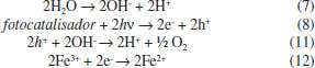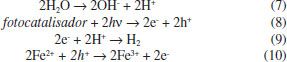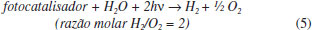 No caso acima, as reaçoes envolvidas sao: Fotossistema 1 (reaçoes 7-10): ![]() A reaçao de oxidaçao do ferro acima ocorre na banda de valência do semicondutor, que apresenta potencial para reduzir a água. A reaçao de reduçao do Fe3+, que ocorre na banda de conduçao do material com a capacidade de evoluir o O2, seria: Fotossistema 2 (reaçoes 7,8, 11,12): ![]() As vantagens deste sistema sao: