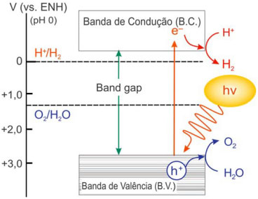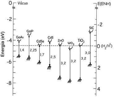 ![]() Figura 1. Principais semicondutores utilizados em fotocatálise: energia de bandgap e potencial redox em soluçao a pH=1. Reimpresso da Ref. 14 com permissao. Copyright 1995 American Chemical Society