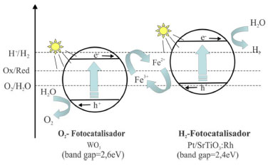 O desenvolvimento de fotocatalisadores irradiados por luz visível para decomposiçao da água em duas etapas foi originalmente introduzido por Bard,38 em 1979. Este sistema, inspirado na fotossíntese natural em plantas verdes, em que CO2 e água sao combinados para formar carboidrato e O2, foi chamado Esquema Z. Neste sistema, dois diferentes fotocatalisadores (ou fotossistemas) sao combinados usando um mediador redox apropriado. Neste caso, a luz visível pode ser utilizada de forma mais eficiente do que em sistemas convencionais, porque a energia necessária para conduzir cada fotocatalisador é reduzida. A estratégia é utilizar materiais ativos no visível, porém em uma combinaçao de tal forma que um dos fotocatalisadores tenha um potencial de reduçao na banda de conduçao mais negativo que o potencial de reduçao do H+ a H2 e outro tenha um potencial na banda de valência mais positivo que o potencial de oxidaçao da água em O2. Por exemplo, o potencial da banda de conduçao do WO3 impede a sua utilizaçao para uma evoluçao de H2, mesmo na presença de metanol.39 No entanto, WO3 é capaz de produzir O2 de uma soluçao aquosa contendo recebedores de elétrons apropriados (Fe2+/Fe3+) sob luz visível, conforme ilustrado na Figura 3.40
