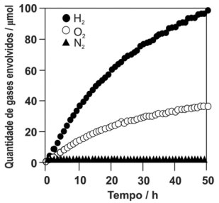 ![]() Figura 4. Evoluçao no tempo para o H2 e O2 sobre a mistura de do Pt/BaTa-O2N (30 mg) e Pt-WO3 (30 mg) em soluçao aquosa de 5 mmol/L de NaI sob luz visível (λ > 420 nm). Reimpresso da Ref. 42 com permissao. Copyright 2009 American Chemical Society