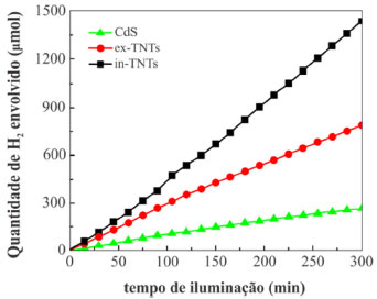 Para efeito de comparaçao, as nanopartículas de CdS foram depositadas no exterior do TNT. Os materiais foram testados para geraçao fotacatalítica de H2 utilizando um reator de Pyrex irradiado com uma lâmpada de xenônio de 300 W, utilizando filtros para remoçao de radiaçao UV. O material foi disperso em água contendo Na2S e Na2SO3 e foi adicionado H2PtCl6 para fotodeposiçao de platina. O resultado de geraçao de H2 está mostrado na Figura 8, na qual se pode observar a diferença de atividade entre o material com CdS na área externa do titanotubo (ex-TNTs) e CdS depositado dentro do TNT (in-TNTs)