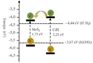 ![]() Figura 9. Proposta de mecanismo para geraçao fotocatalítica de hidrogênio utilizando o compósito CdS/MoS2 como catalisador. Os valores de energia no gráfico sao em relaçao ao vácuo. Adaptada da Ref. 63
