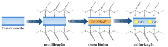Na mesma linha de pesquisa anterior, Long et al.61 realizaram a síntese de titanotubos (TNT), nos quais foram formadas nanopartículas confinadas de CdS a partir da sulfurizaçao com tiouréia, conforme a Figura 7.