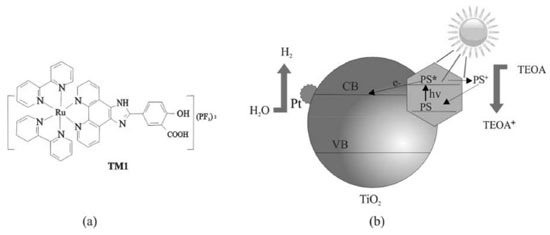 Figura 10. Mecanismo de geraçao de H2 por sensibilizaçao do TiO2 (b) utilizando TM1(a). Adaptada da Ref. 66