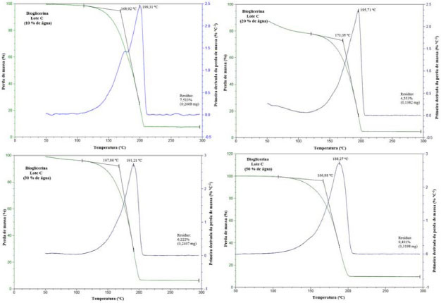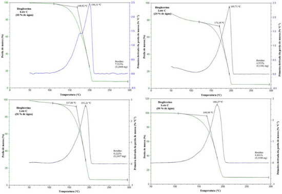 Observa-se na Tabela 2 que os picos máximos das curvas obtidas para as bioglicerinas avaliadas com taxa de aquecimento de 20 ºC min-1 sao deslocados para uma temperatura maior quando comparado às curvas obtidas com taxa de aquecimento menor (10 ºC min-1). No entanto, nao se observou uma relaçao direta da perda de massa com o aumento da taxa de aquecimento como citado por Castelló et al.,34 os quais mostraram que para glicerina P.A. os efeitos térmicos e mássicos sao mais intensos quanto maior é a taxa de aquecimento. Vale ressaltar que, segundo os fornecedores, estas bioglicerinas possuem diferentes porcentagens de voláteis, metanol, cinzas e/ou outras impurezas (Tabela 1) e isso pode ter influenciado as temperaturas de degradaçao obtidas a partir das curvas de TGA/DTG mesmo elas possuindo o mesmo grau de pureza. Com o intuito de verificar a estabilidade térmica das bioglicerinas misturadas com a água obtiveram-se curvas TGA/DTG com taxa de aquecimento de 10 ºC min-1 para a bioglicerina lote C, acrescida de 10, 20, 30 e 50% de água como pode ser visualizado pela Figura 2.