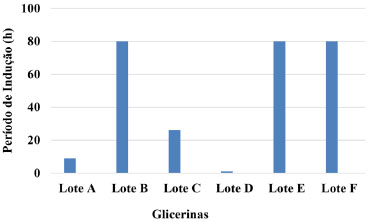 ![]() Figura 3. Período de induçao (horas) obtido em atmosfera oxidante por meio de um Rancimat para as bioglicerinas avaliadas