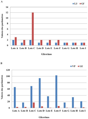 ![]() Figura 4. Representaçao gráfica comparativa das propriedades reológicas para as bioglicerinas após o envelhecimento: A) viscosidade L3 (3 rpm) e força gel final Gf (lbf 100ft-2); B) viscosidade plásitca VP (cP) e limite de Escoamento LE (lbf 100 ft-2)
