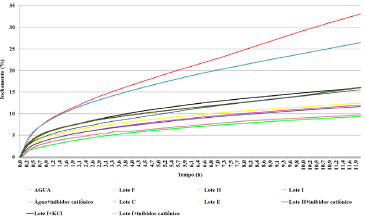 ![]() Figura 5. Representaçao gráfica comparativa das curvas de porcentagem de inchamento de argila versus tempo (horas) para água e algumas glicerinas testadas com e sem inibidores