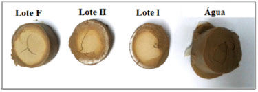 A análise da Figura 5 mostrou que as bioglicerinas analisadas com e sem inibidores apresentaram porcentagens de inchamento menores que 15,5%, abaixo dos percentuais de inchamento da água com e sem inibidor, cujos valores alcançaram máximos de 26 e 33%, respectivamente. Isto mostra que o uso dessas bioglicerinas como base para fluidos de perfuraçao, mesmo na ausência de inibidores de inchamento de argila, podem minimizar os problemas relativos à instabilidade de poços especialmente quando se perfura zonas com folhelhos. A glicerina do lote F, a qual apresenta uma maior quantidade de glicerol (99,7 - 100%) (Tabela 1), apresentou maior eficiência na inibiçao de inchamento de argila, com um valor máximo em torno de 9%, seguida pelas bioglicerinas dos lotes C, E e H que possuem em torno de 84% de glicerol e apresentaram em torno de 12% de inchamento. Já a bioglicerina do lote I, a qual possui menor teor de glicerol (72%) com e sem inibidor de inchamento apresentou comportamento semelhante para este teste, com porcentagens máximas entre 15 e 16%. Este resultado mostra que quanto maior quantidade de glicerol presente na bioglicerina usada, maior poderá ser sua eficiência para inibir o inchamento de argilas, ou seja, menor será a interaçao da bioglicerina com o folhelho e, portanto, menor serao os problemas relacionados à instabilidade do poço. Vale ressaltar que quanto maior a quantidade de glicerol, maior será o custo da glicerina. Neste caso, é imprescindível que se verifique a relaçao custo-benefício para utilizaçao desta base mais purificada. O uso dos inibidores catiônicos mostraram uma melhora na eficiência de inchamento de argila, uma vez que quando ocorre troca dos íons Na+ presentes nas entrecamadas dos folhelhos pelos íons K+ do inibidor catiônico, a estrutura da argila fica mais estável, dificultando a delaminaçao das partículas.43 Assim, por exemplo, a bioglicerina lote H com adiçao da soluçao catiônica livre de cloreto apresentou uma porcentagem de inchamento semelhante ao da glicerina purificada (lote F), com máximo em torno de 10%. Os dois inibidores utilizados, KCl e a soluçao catiônica livre de cloreto, apresentaram praticamente a mesma eficiência quando foram usados com a bioglicerina do lote I, podendo a escolha ser determinada pelo valor do produto ou pelas restriçoes ambientais. Os inibidores inorgânicos, como o KCl ou NaCl, possuem baixo custo, mas podem causar danos ambientais e, por isso, sao normalmente substituídos por sais isentos de cloreto, mesmo estes sendo de custos mais elevados. A Figura 6 mostra as imagens da face interna dos corpos de prova de argila bentonita utilizados nos testes de inchamento. É visível como a água invade todo corpo de prova e ocorre inchamento da amostra. Já para as bases glicerinas o centro do corpo de prova permanece seco e intacto. Observa-se, ainda, que o raio de invasao é menor quando se usa a glicerina purificada, corroborando o que foi observado pelo gráfico da Figura 5.