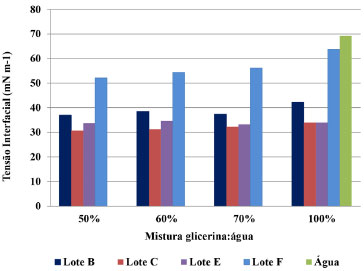 ![]() Figura 7. Gráfico representativo da tensao interfacial (mNm-1) para diferentes proporçoes da mistura água:glicerina dos lotes B, C, E e F