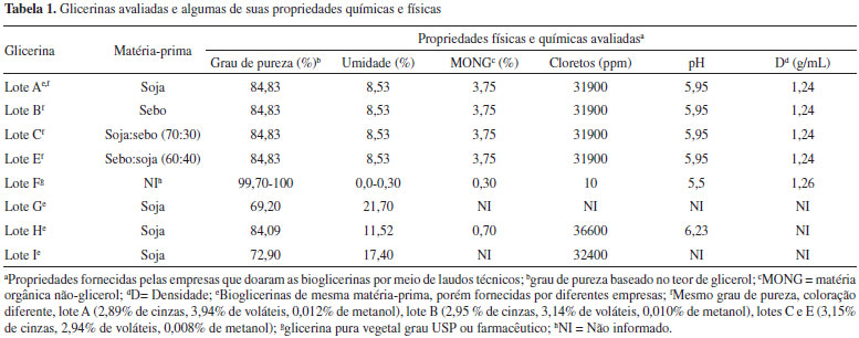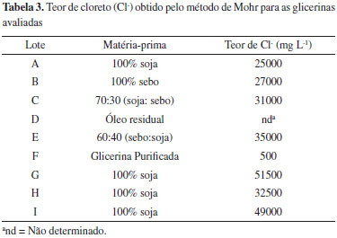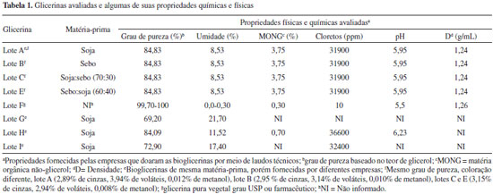 PARTE EXPERIMENTAL Os procedimentos laboratoriais utilizados neste trabalho, com exceçao das análises de caracterizaçao química, foram baseados nas normas API para fluido aquoso API RP 13B-1 (2009).32 Vale ressaltar que nao existem normas API ou outras para qualificar uma base para fluidos de perfuraçao de poços de petróleo e gás e, por isso, resolveu-se testar várias técnicas de caracterizaçao para glicerinas de diferentes características e origens com o intuito de estabelecer um protocolo padrao para caracterizaçao desta matéria-prima como base para formulaçao destes fluidos. Amostras de glicerinas Foram avaliadas amostras de bioglicerinas provenientes de diferentes processos de produçao de biodiesel e de várias fontes como soja, sebo, misturas soja:sebo fornecidas pela empresa Fuga Couros S/A (BIOFUGA/RS) com as seguintes proporçoes: 100% soja (Lote A), 100% sebo (Lote B), 70:30 soja:sebo (Lote C), 60:40 sebo:soja (Lote E). Utilizou-se também uma bioglicerina de óleo residual fornecida pela empresa Biotechnos (Lote D), uma amostra de glicerina purificada comercial fornecida pela empresa Oxiteno (Lote F), duas amostras fornecidas pela Petrobras denominadas bioglicerina loira A (Lote G) e loira B (Lote I), ambas 100% soja e, por fim, outra bioglicerina 100% soja fornecida pela Cargil (Lote H). Em alguns desses lotes as bioglicerinas foram entregues com laudos técnicos informando o teor de glicerol, umidade, MONG, pH e densidade, como mostra a Tabela 1.