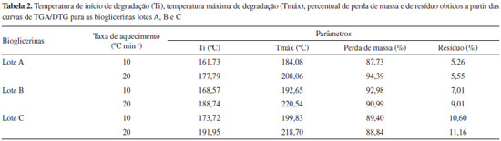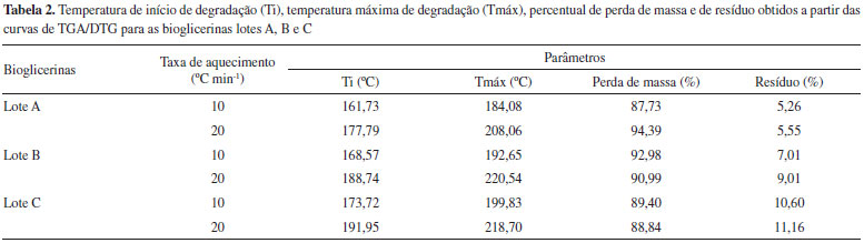Análises térmicas (TGA/DTG e CTP) e estabilidade oxidativa das bioglicerinas A análise termogravimétrica foi utilizada para determinar a temperatura referente a perda de massa devida à vaporizaçao do glicerol, a temperatura de início de degradaçao térmica, a temperatura máxima de degradaçao e a porcentagem de perda de massa das bioglicerinas avaliadas nas duas taxas de aquecimento (10 e 20 ºC min-1). A determinaçao da temperatura máxima de degradaçao foi feita com base na 1ª derivada (DTG). A perda de massa devido à vaporizaçao de algum componente presente na mistura com a bioglicerina iniciou-se em torno de 120 ºC para todas as bioglicerinas avaliadas, independentemente da taxa de aquecimento, semelhante ao observado por Castelló et al.,34 que utilizaram 10-20 mg de glicerina P.A. Além disso, observou-se que a degradaçao térmica das bioglicerinas ocorreu em um único evento de perda de massa envolvendo apenas um passo de degradaçao. A Tabela 2 apresenta os valores obtidos a partir das curvas TGA/DTG (Figura 3S) para as temperaturas de início de degradaçao (Ti), temperaturas máximas de degradaçao (Tmáx), percentual de perda de massa e de resíduo gerado no final do processo, o qual pode estar relacionado a formaçao de novos produtos de polimerizaçao, oxidaçao ou outros20 para as bioglicerinas lotes A, B e C. Em condiçoes de temperatura de 349-475 ºC, Bühler et al.21 observaram a degradaçao da glicerina, com conversoes entre 0,4 e 31%, gerando metanol, acetaldeído, propionaldeído, acroleína, álcool alílico, etanol, formaldeído, CO, CO2, e H2.