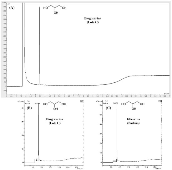 Figura 1. (A) Cromatograma da bioglicerina lote C obtido por CG/DIC; (B) Cromatograma da corrente total de íons da bioglicerina lote C obtido por CG/EMIT e (C) Cromatograma da corrente total de íons da glicerina P.A utilizada como padrao obtida por CG/EMIT