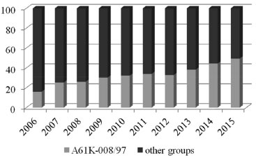 RESULTS AND DISCUSSION Subclass A61Q (Specific Use of Cosmetic or Similar Toilet Preparations) yielded 72611 "mother" patent - filled at the first application date - on the Derwent database from 1995 to 2015. From these, 32% were classified in subgroup A61K-008/97, which refers to "Cosmetics or similar toilet preparations of vegetable origin". Considering the number of patents in this IPC subgroup, it was observed an increase in the use of natural products, per year, in cosmetics using plants, during last 10 years, up to 49% in 2015, as shown in Figure 1.