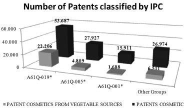CONCLUSION The study evidenced the increase of natural products in cosmetics field reaching a large number of patent applications every year than traditional cosmetics. This may be driven by the increased focus on environmental sustainability trends, suggesting the search for new products in the coming years. Anti-aging and whitening skin appeared as the most patented products pointing this category as an opportunity to develop new products due to the desire of people in maintaining young appearance with the life expectation's increase specially in Asiatic countries even with the restricted control to the market of these products. Search on Derwent database revealed that natural products have been applied in cosmetics as active ingredient in form of extract and/or phytocompound added to a creams, lotions, suspensions or gels. We highlighted the main family and genera applied to cosmetic patents and evaluated the information regarding its biological activity in literature and in patent database and the results showed that information were complementary and may provided a better understating of potential herbs considering the future trends of this technology as bioactivity and commercial demand.