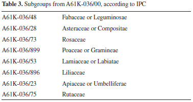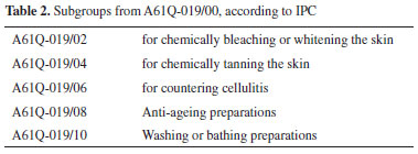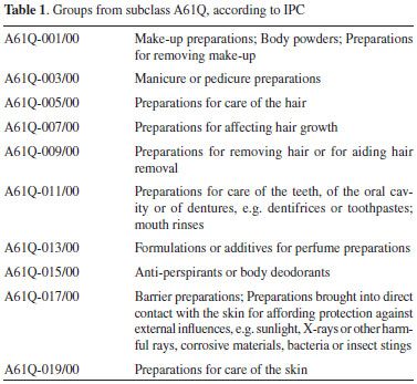 METHODOLOGY Patent investigation was conducted using Derwent World Patents Index (Thomson Reuters Scientific, US) licensed by University of Sao Paulo. The study was carried out on natural products applications in cosmetology from 1995 to 2015, examining the number of patents, the date of deposit, depositor profile and International Patent Classification (IPC). It was utilized only the patents filled at the first application date in order to exclude repeated data, called here as "mother" patent. We examined firstly the IPC A61Q subclass (Specific use of cosmetic or similar toilet preparations), then A61Q and A61K-008/97 (Similar cosmetic preparations for personal hygiene from vegetable origin) and finally A61Q-019* (Preparations for care of the skin) and A61K-008/97. Asterisk character code was used to retrieve all possible patents from "Preparations for care of the skin". The information collected from IPC subclass and subgroups was analyzed to set a complete panel of the major countries-patent depositors and main applications of plants used in cosmetic patents. A61Q-019 and A61K-008/97 subgroups were integrated with the scientific literature to compare both scientific and technological information retrieved for the main plants families and genera listed in A61K-036/00 subgroup "Medicinal preparations of undetermined constitution containing material from algae, lichens, fungi or plants, or derivatives thereof". All group and subgroup studied are arranged on Tables 1-3. The search for detailed information concerning patent applications and plant families and genera was performed by the combination of specific IPC and the plant genera in patent title.