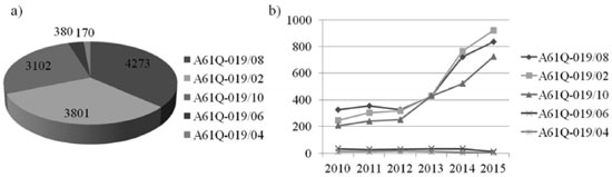 Figure 4. a) Relevance of cosmetic patents for skin treatment from plant origins and b) tendency graph between 2010-2015. A61Q-019/02: chemically bleaching or whitening the skin, A61Q-019/04: chemically tanning the skin, A61Q-019/06: cellulite treatment, A61Q-019/08: anti-ageing preparations, and A61Q-019/10: washing or bathing preparations