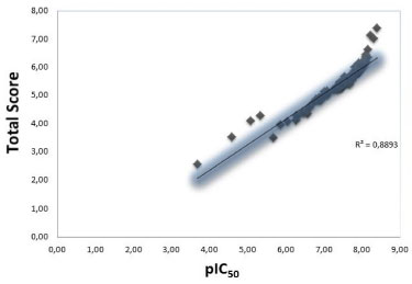 ![]() Figure 4. Correlation between pIC50 VS Total Score of indene pyrazol ligands
