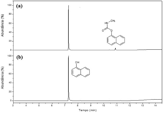 ![]() Figura 2. Cromatograma do padrao carbaril (a), e do padrao 1-naftol (b)