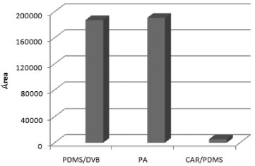 Para o modelo proposto, o termo (x2)2 da equaçao foi desprezado, pois o mesmo nao foi significativo para a determinaçao de y. ![]() Quanto às fibras avaliadas, a PDMS/DVB foi escolhida como a de melhor rendimento, embora a fibra PA tenha mostrado um sutil aumento na área do pico cromatográfico, para o carbaril (Figura 3). Os motivos pelos quais a fibra PDMS/DVB foi escolhida está relacionado aos melhores resultados na precisao das duplicatas para cada ponto, assim como sua característica de polaridade mista, podendo esta fibra interagir tanto com compostos de baixa polaridade como o padrao substituto pirimicarbe, o analito carbaril e compostos de maior polaridade como o 1-naftol produto de degradaçao térmica do carbaril.40,41