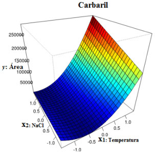 ![]() Figura 4. Gráfico de superfície de resposta na determinaçao da máxima extraçao de carbaril, por MEFS-headspace em funçao da temperatura e força iônica (NaCl)