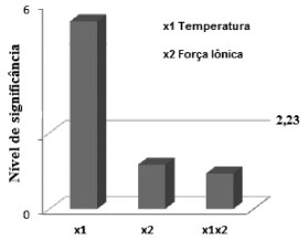 ![]() Figura 5. Gráfico de pareto, indicando quais parâmetros (x1, x2) ou interaçao (x1x2), possuem influência significativa (nível de confiança de 95%) sobre cada variável resposta
