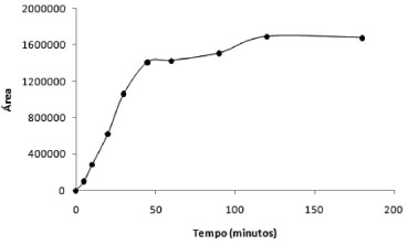 O estudo do tempo de equilíbrio (Figura 6) nos mostrou que a partir de 40 minutos houve uma pequena variaçao na área do pico cromatográfico do composto extraído, entrando em equilíbrio após 120 minutos. Para tempos de equilíbrio longos, um pré-equilíbrio para quantificaçao pode ser considerado, desde que as condiçoes do sistema (temperatura, agitaçao, força iônica, pH, dentre outros) sejam mantidas constantes.42,43