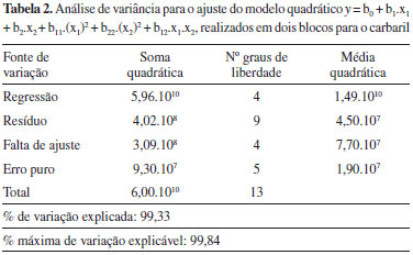 Após a escolha da fibra, observou-se que o comportamento nao linear da superfície de resposta sugere uma expansao do planejamento linear para quadrático, o que pode ser confirmado pelo gráfico de superfície de resposta após expansao (Figura 4) e pelo estudo da ANOVA análise de variância (Tabela 2).