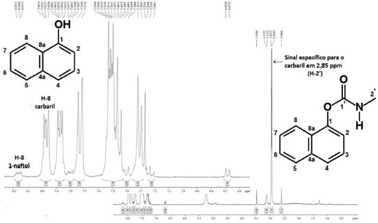 Por fim, dadas as condiçoes de limitaçao no aumento da temperatura, discutidas anteriormente, e das características do analito e do modo de extraçao (headspace), e devido ao baixo valor na constante de Henry do composto (9,20.10-5 Pa m3 mol-1),41 foi adotado um tempo de extraçao (pré-equilíbrio) para o método de 40 minutos. Esse tempo é necessário pelo fato de o analito precisar difundir-se a partir da fase condensada antes de atingir a fibra. Nesse caso, a extraçao pode ser otimizada com agitaçao mais eficiente ou, o que seria inviável, o aumento da temperatura de extraçao.42 Com isso, observa-se que incorporar as variáveis agitaçao e tempo de extraçao, em um novo planejamento experimental, possam otimizar ainda mais o tempo de extraçao, tornando o método ainda mais eficiente. Degradaçao térmica do carbaril na MEFS-headspace determinada por RMN H1 Como pode ser observado na Tabela 3, os deslocamentos referentes aos padroes individuais do carbaril e do 1-naftol, o singleto referente ao H-2' em 2,85 ppm é específico para o carbaril (Figura 7), sendo que a relaçao entre esse singleto e o duplo dubleto em 8,21 ppm no H-8 do 1-naftol pode fornecer de maneira direta a relaçao de degradaçao térmica do carbaril em 1-naftol nas condiçoes de extraçao estudada, que seria de 7,75% de 1-naftol produzido.8