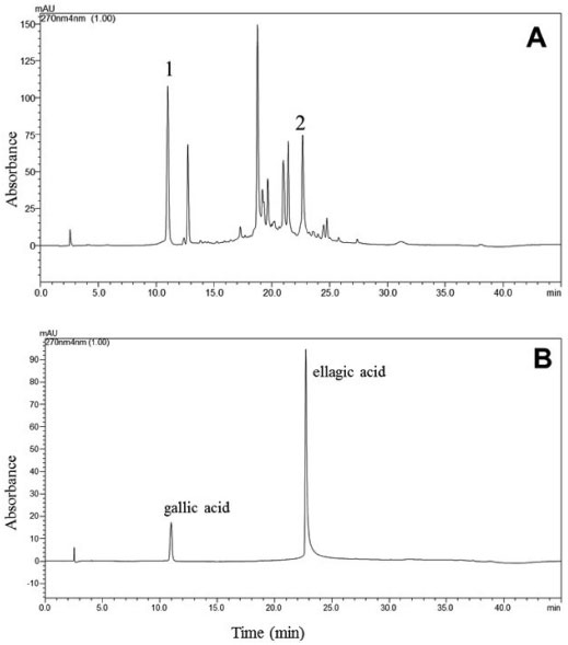 ![]() Figure 1. HPLC chromatograms of (A) hydroethanolic extract of C. villosum pulp and (B) mixture of gallic and ellagic acids standards