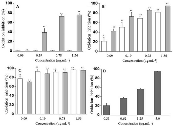 Figure 2. Antioxidant activity the C. villosum extracts ethanol (white) and hydroethanolic (gray) - (A) Seed; (B) Pulp; (C) shell extracts; (D) Control standards quercetin (0.09-1.56 µg.mL-1) in the 3T3L1 mouse embryonic fibroblast cell line. The antioxidant activity values are the mean ± S.D from three independent experiments. Significance was determined using Student's-t-test (*p < 0.05; **p <0.01 compared to quercetin)