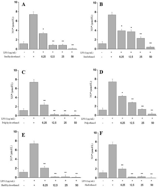 Figure 3. Effect of the C. villosum extracts on NO production in LPS-stimulated J774 cells. (A) Seed (hydroethanolic); (B) Seed (ethanol); (C) Pulp (hydroethanolic); (D) Pulp (ethanol); (E) Shell (hydroethanolic); (F) Shell (ethanol). Production of NO was assayed in culture supernatants of macrophages stimulated with LPS (1µg mL-1) for 24 h in the presence of the extracts (6.25-50 µg mL-1). The nitrite values are the mean ± S.D from three independent experiments. Significance was determined using Student's-t-test (*p < 0.05; **p <0.01 compared to LPS). Abbreviations: LPS, Lipopolysaccharide; NO, nitric oxide
