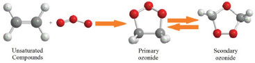 ![]() Figure 1. Two intermediates five-member ring structure in ozonolysis reaction of unsaturated compounds (atomic representations: O = red, C = gray, H = white)