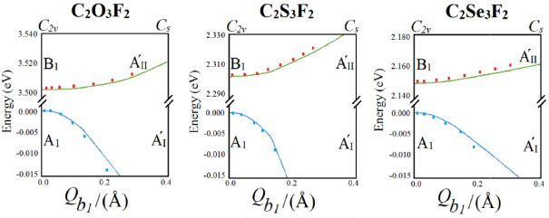 Figure 4. The APES profiles of C2Y3F2 (Y= O, S, Se) series (lines) and the numerical fitting of the energies obtained from the PJTE equations (points) along the b1 puckering direction in eV