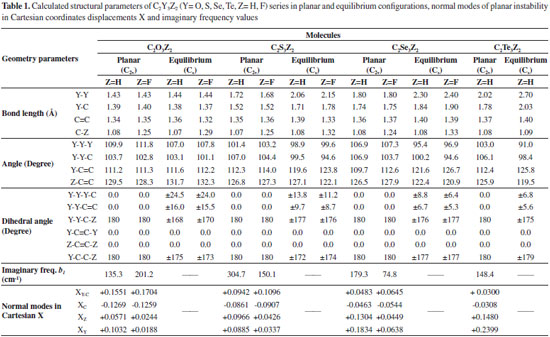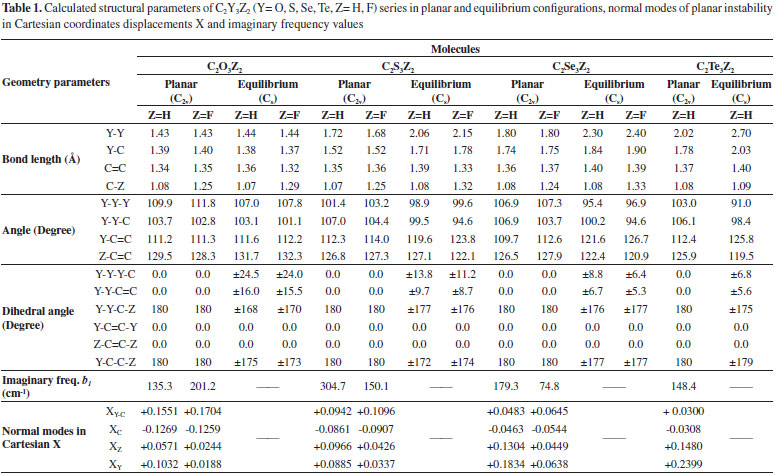 CONCLUSIONS An imaginary frequency coordinate in out-of-plane of the molecules was observed through the ab initio DFT optimization and following frequency calculations in planar configuration of C2Y3Z2 (Y = O, S, Se, Te, Z = H, F) series. It provides very important information about the symmetry breaking phenomenon in all under consideration compounds in the series. In other hand all those compounds in the C2Y3Z2 series do not hold their planarity due to the PJTE and they distort from their unstable planar configuration with C2v symmetry to the stable Cs symmetry geometry. The APES cross sections of the series were revealed that the ground state (1A1) and the excited 1B1 state along b1 nuclear displacements could interact vibronically and the (1A1+1B1) ⊗b1 problem is the reason of instability of the C2Y3Z2 series in their planar configuration. Estimation of the vibronic coupling constant values, F, in the C2Y3H2 series illuminate that the most unstable planar configuration in the series is corresponded to C2Te3H2 five-member ring compound. It is also clear that planar stability in the systems rises by decreasing the Y atoms size in the series, except in C2Se3H2. Additionally, the molecules puckering in both C2S3F2 and C2Se3F2 compounds were decreased by replacing the H atoms with F ligands in the C2Y3H2 series, although C2O3F2 compound shows opposite behavior in the C2Y3F2 under consideration series.