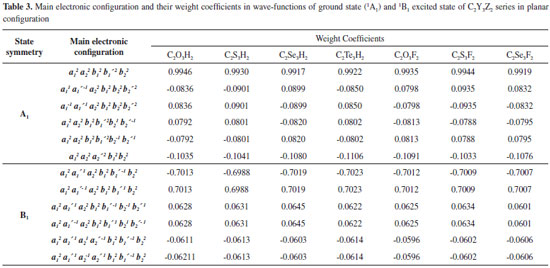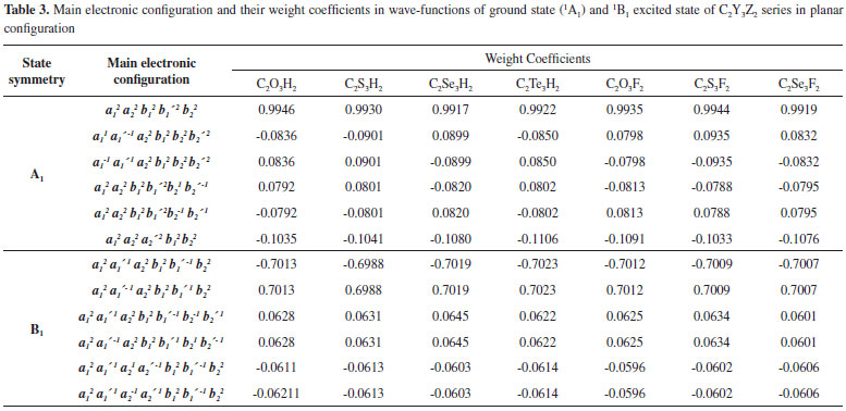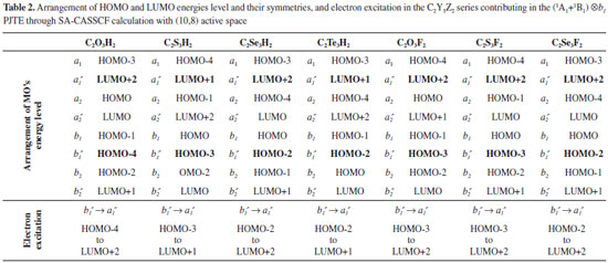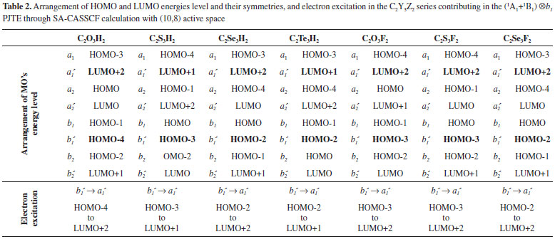 ACTIVE SPACE IN SA-CASSCF CALCULATION Several active spaces have been checked in SA-CASSCF calculations and the result of calculations were compared together. The results revealed that ten electrons and eight active orbitals which was composed the CAS(10,8) active space is appropriate in under considered C2Y3Z2 series. Additionally, the CAS(10,8) results comparison to the smaller CAS(4,3), CAS(6,6), and CAS(8,8) and lager CAS(12,12) active spaces that previously have been applied in similar PJTE origin studies;22,24,27,31 was proved that CAS(10,8) active space sufficiently is good in present study. From Table 2 is also appeared that the eight orbitals included 2a1, 2b1, 2b2, and 2a2 were being contributed to the electron excitations of the C2Y3Z2 series. The main electronic configuration calculation for all C2Y3Z2 considered compounds (see Table 3) was showed that b1'→a1', electron excitation occurred and it proved that (1A1+1B1) ⊗b1 PJTE problems are the reason of the breaking symmetry phenomenon and non-planarity of C2Y3 rings in the series.