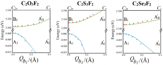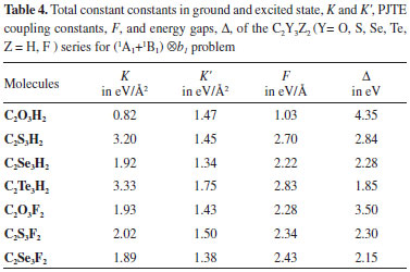 As from Figures 3 and 4 were illuminated, instability in planar configuration occurs in all C2Y3Z2 (Y= O, S, Se, Te, Z= H, F) compounds and the origin of the PJTE in the series are may explained via solution of the PJTE (1A1+1B1) ⊗b1 problem. For explanation of origin of the PJTE in the series, K, K' and Fparameters were estimated by the numerical fitting of Equation (7) with the APES energy profiles along the twisting direction (Qb1) which is revealed in Table 4. Since small values of higher order of Q4 parameters in comparison with Q2 and Q4, the numerical fitting of the equation was done up to the second term of the series in Equation (7).