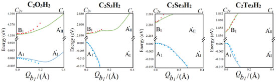 Figure 3. The APES profiles of C2Y3H2 (Y= O, S, Se, Te) series (lines) and the numerical fitting of the energies obtained from the PJTE equations (points) along the b1 puckering direction in eV